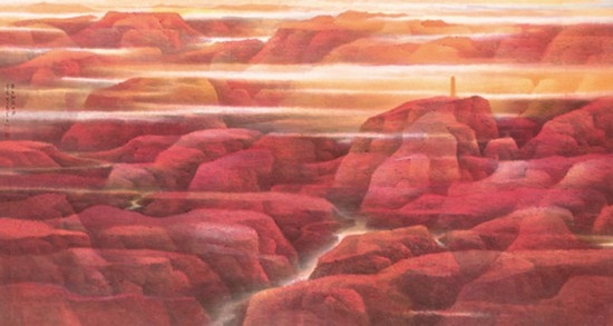 來自上海并深受海派畫學(xué)影響的樂震文、張弛,在宋元及明清山水畫學(xué)上打下了深厚的功底,也因此,他們的傳統(tǒng)山水畫深受日本民眾的歡迎。他們曾游居?xùn)|瀛多年,轉(zhuǎn)道再度研習(xí)了中國傳統(tǒng)文人畫。但真正改變他們畫風(fēng)的,卻是他們對中國北方大山大水的寫生攬勝。他們鐘情于英雄的太行山,忘情于革命勝地陜北高原,力求通過壯闊雄渾的山巒、連綿逶迤的群峰來表達(dá)他們的時代感悟,營構(gòu)儲存于他們胸中的山川氣象。所謂“山河回聲”,正是這些作品抒發(fā)的中華民族歷經(jīng)歲月風(fēng)華在大好河山之中回響的奮斗激情。