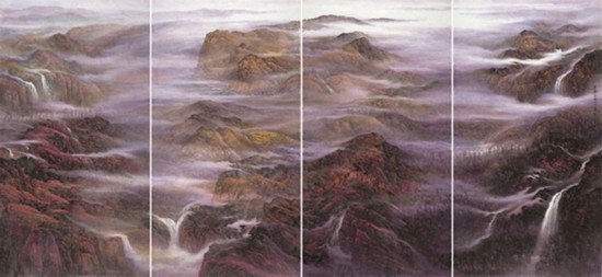 且看樂震文的《直上浮云》《云卷云舒》和《黃土馳風(fēng),日月星辰》,那逶迤茫茫的群山峻嶺,那縱橫畫面的云蒸霞蔚,那連綿不絕的箭樓城堞,哪里還是傳統(tǒng)文人山水畫的淡煙輕嵐,縹緲冷逸?濃縮于畫內(nèi)的精神意蘊,分明凸顯了現(xiàn)代山水畫對家國情懷的抒發(fā)。且讀張弛的《云起疊嶂》《惟余莽莽》和《紫氣氤氳》,那天光紫氣的浩渺煙云,那渾然一體的山水氣象,那千回百轉(zhuǎn)的流水飛泉,其實早已脫離了對自然山水的寫照,而是她感悟的時代精神在偌大畫面上的縱橫揮寫、主觀臆造。