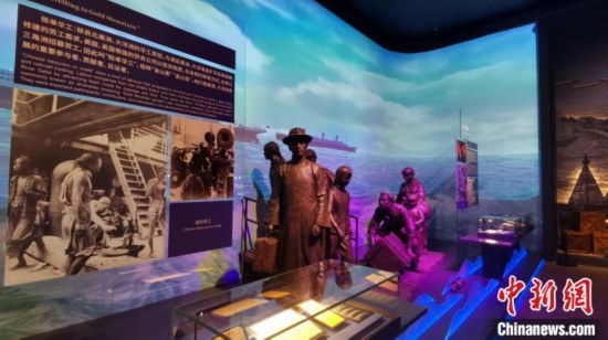 中國(guó)僑都華僑華人博物館展示當(dāng)年“契約華工”出洋工作的場(chǎng)景和資料。江門(mén)市委宣傳部 供圖