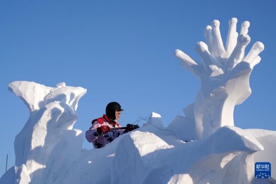 1月7日,選手在哈爾濱太陽(yáng)島雪博會(huì)園區(qū)進(jìn)行雪雕創(chuàng)作。