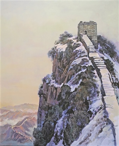 在長(zhǎng)城沿線居民看來(lái),長(zhǎng)城是他們?nèi)粘I畹囊徊糠?。美術(shù)工作者試圖將長(zhǎng)城的這種平凡之美體現(xiàn)在作品中。陳平中國(guó)畫(huà)《長(zhǎng)城腳下》、蔣世國(guó)中國(guó)畫(huà)《家住長(zhǎng)城溪水邊》等作品,均以俯瞰視角描繪長(zhǎng)城腳下人家的閑適生活。在畫(huà)家筆下,長(zhǎng)城并非抽象之物,而是許多人從小生活的地方,是帶著煙火氣、承載著鄉(xiāng)愁的古跡。王合群油畫(huà)《長(zhǎng)城腳下的鄰居》更是別出心裁,聚焦生活在長(zhǎng)城腳下的老兩口的新生活,屋內(nèi)干凈整潔,窗外長(zhǎng)城巍峨,畫(huà)面生動(dòng),意趣盎然。這些作品共同呈現(xiàn)了長(zhǎng)城親切而鮮活的一面。