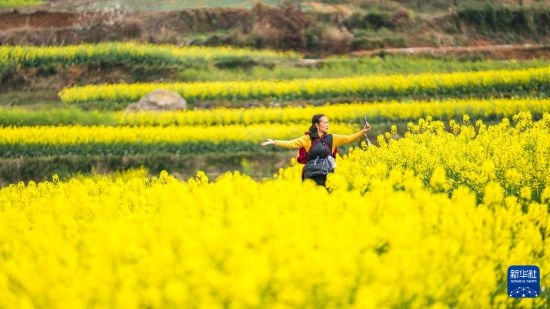 游客在六枝特區(qū)木崗鎮(zhèn)瓦窯村的油菜花田里自拍留念(3月12日攝)。