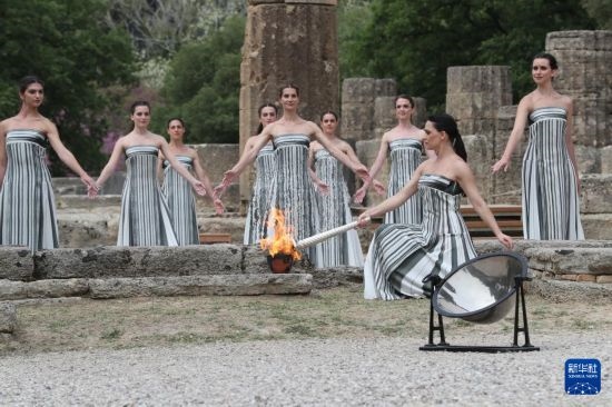 當?shù)貢r間12時16分,在有2500多年歷史的赫拉神廟遺址前,由希臘女演員瑪麗·米娜扮演的古希臘女祭司向光明之神阿波羅祈禱后點燃了火種。由于現(xiàn)場多云,火種點燃環(huán)節(jié)沒有采用傳統(tǒng)的凹面鏡取火,而是選用了此前備用的火種。