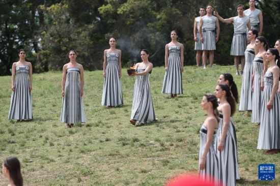 4月16日,扮演最高女祭司的演員瑪麗·米娜取得圣火。當日,2024年巴黎奧運會圣火火種采集儀式在希臘伯羅奔尼撒半島的古奧林匹亞遺址舉行。新華社記者李京攝