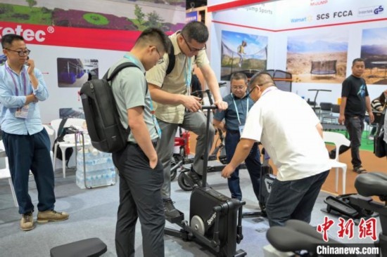 5月1日,采購商在廣交會(huì)上嘗試專業(yè)健身器械。中新社記者 陳驥旻 攝