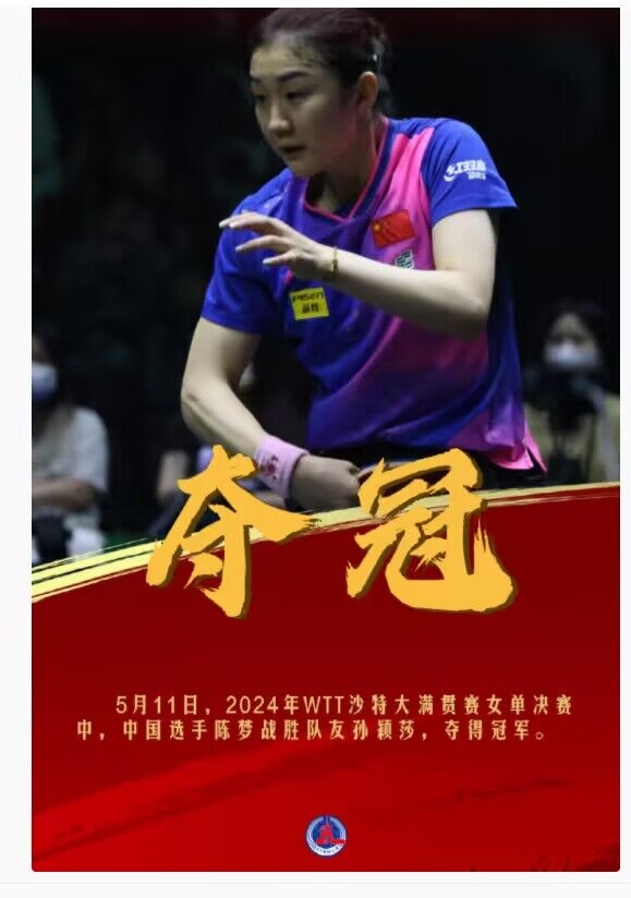 今天,在2024年WTT沙特大滿貫賽女單決賽中,中國選手陳夢戰(zhàn)勝隊友孫穎莎 ,奪得冠軍。祝賀陳夢,孫穎莎辛苦了!拼過就是勝利,繼續(xù)加油?。ㄓ浾撸和鹾V蓿?/p>