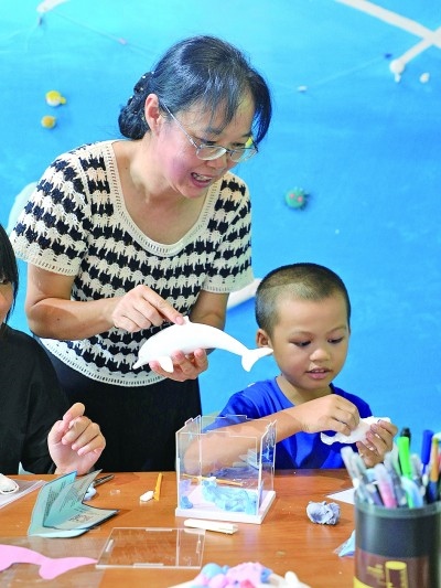 廣西欽州三娘灣的小朋友在學習制作中華白海豚黏土模型。
