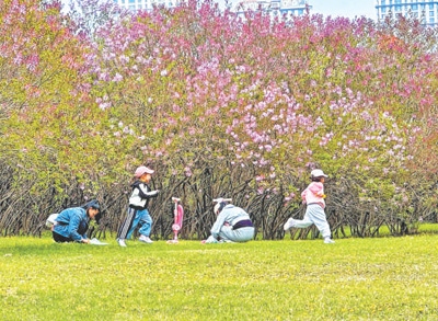 小朋友們在丁香樹叢間玩耍。苗麗田攝(人民視覺)