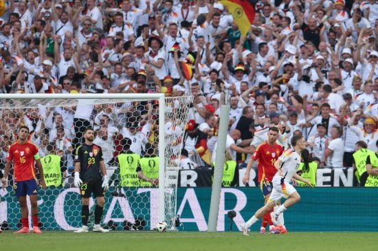 久攻之下,德國(guó)隊(duì)終于在第89分鐘扳平比分,米特爾施泰特左路傳中,基米希頭球回?cái)[,維爾茨抽射入網(wǎng)。兩隊(duì)在常規(guī)時(shí)間1:1戰(zhàn)平,比賽進(jìn)入加時(shí)賽。第106分鐘,德國(guó)隊(duì)穆夏拉射門擊中西班牙隊(duì)庫(kù)庫(kù)雷利亞手臂,后者當(dāng)時(shí)在本方禁區(qū)內(nèi)防守,但主裁判并沒有判罰點(diǎn)球,VAR(視頻助理裁判)也沒有介入。