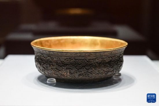 8月31日在海南省博物館拍攝的“物華天寶 黎海瓊珍——故宮博物院藏海南文物特展”展出的清代椰子木雕云蝠紋鑲金里碗。