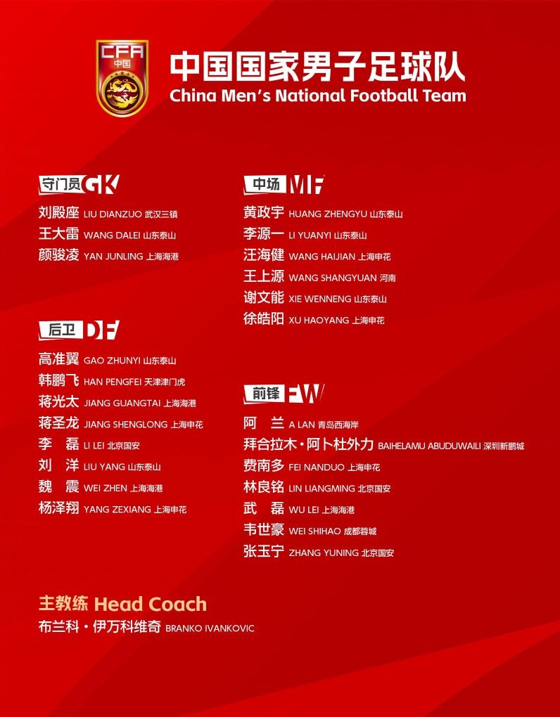 以下為24人大名單:武磊、顏駿凌、蔣光太、魏震(上海海港),王大雷、劉洋、高準(zhǔn)翼、黃政宇、謝文能、李源一(山東泰山),韋世豪(成都蓉城),費(fèi)南多、蔣圣龍、徐皓陽、楊澤翔、汪海健(上海申花),李磊、張玉寧、林良銘(北京國安),劉殿座(武漢三鎮(zhèn)),韓鵬飛(天津津門虎),王上源(河南),拜合拉木·阿卜杜外力(深圳新鵬城),阿蘭(青島西海岸)。