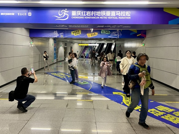 國慶前夕,這里剛舉辦了一場垂直馬拉松。賽事帶來品牌效應(yīng),前來打卡的人群絡(luò)繹不絕?!按怪瘪R拉松一般在摩天大樓里舉辦,如今地鐵站里居然能跑馬拉松,重慶總是能給游客帶來驚喜。”來自河北的游客張楠說。