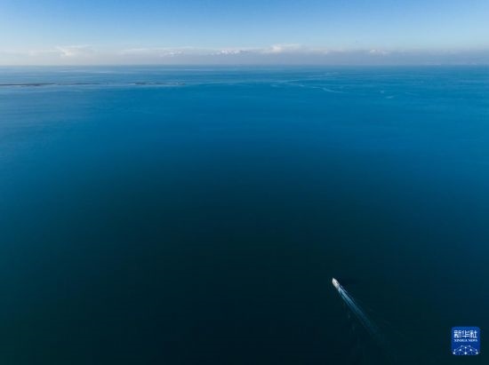 10月18日,一艘游輪行駛在青海湖二郎劍景區(qū)(無人機照片)。