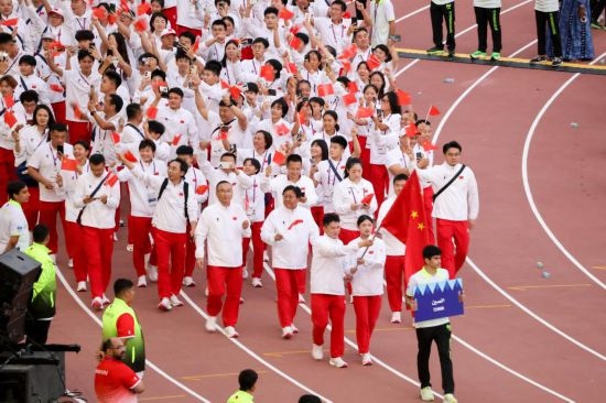 開幕式上,中國代表團(tuán)第13個入場,旗手由乒乓球隊男子運(yùn)動員李天陽和跆拳道隊女子運(yùn)動員酈雨琪擔(dān)任。本屆運(yùn)動會中國代表團(tuán)共派出全國22個省區(qū)市的103名運(yùn)動員參賽,其中女子運(yùn)動員55人,男子運(yùn)動員48人,將參加田徑、游泳、三對三籃球、沙灘排球、網(wǎng)球、跆拳道、國際象棋等17個大項、124個小項的比賽。