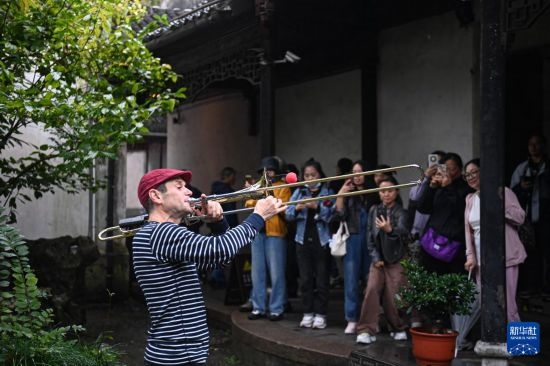 10月27日,來(lái)自瑞典的藝術(shù)表演者在南潯古鎮(zhèn)小蓮莊為游客演繹互動(dòng)音樂(lè)會(huì)。