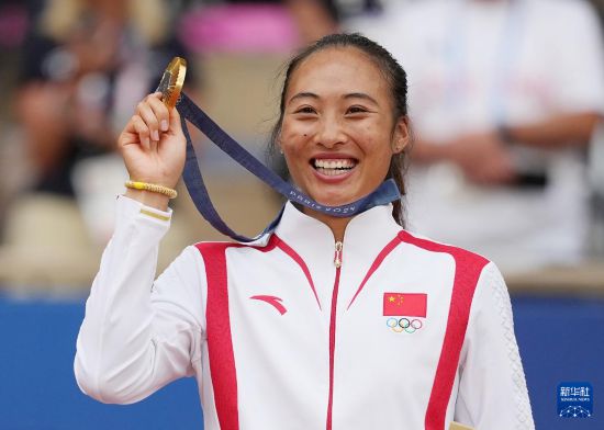這是2024年8月3日,冠軍中國選手鄭欽文在巴黎奧運(yùn)會(huì)網(wǎng)球女子單打頒獎(jiǎng)儀式上。新華社記者 萬象 攝