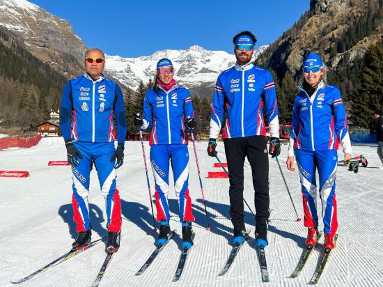 2022年1月24日,泰國越野滑雪隊運動員卡倫·尚?。ㄗ蠖ⅠR克·尚?。ㄗ笕┡c父母在歐洲備戰(zhàn)訓練時合影。新華社發(fā)(受訪者供圖)