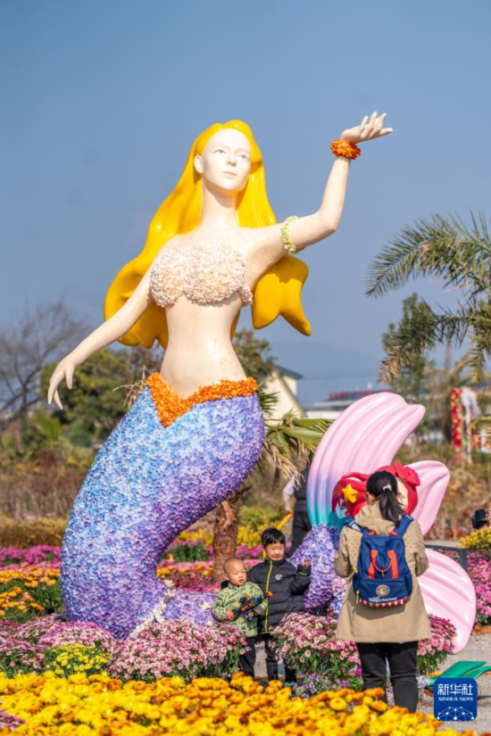 2月21日,兩名小朋友在昆明市海洪莫奈花園拍照留念。