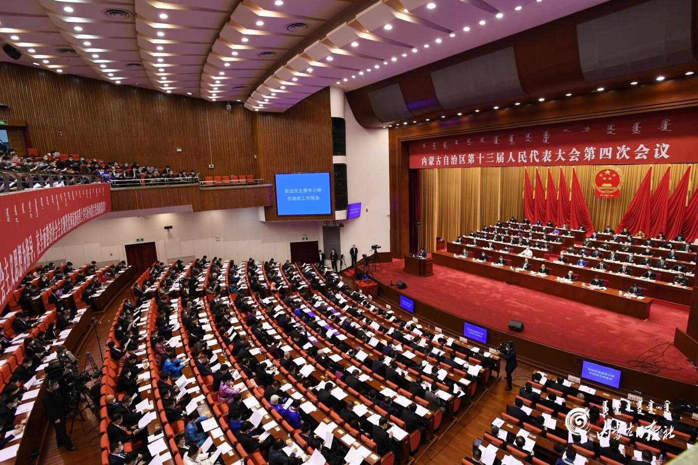 當(dāng)天的內(nèi)蒙古人民會堂國徽莊嚴(yán),室內(nèi)華燈璀璨,十面紅旗分列主席臺兩側(cè),二樓眺臺上懸掛著“以習(xí)近平新時代中國特色社會主義思想為指導(dǎo),在全面建設(shè)社會主義現(xiàn)代化國家新征程上書寫好內(nèi)蒙古發(fā)展新篇章”的橫幅,會場氣氛隆重?zé)崃摇?/p>