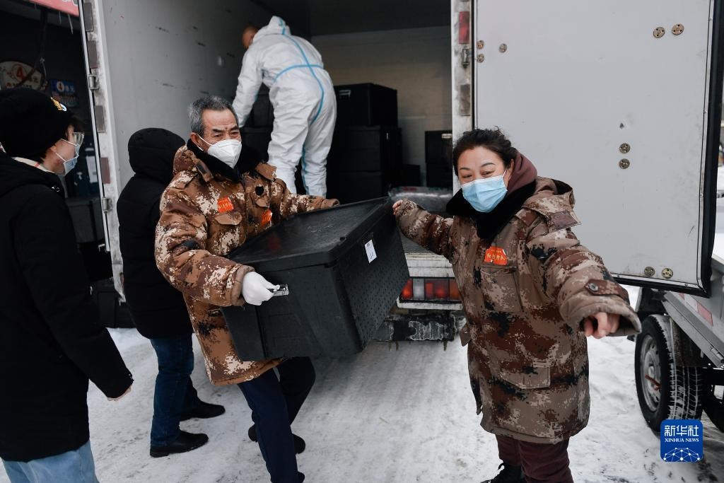 趙淑華(右一)指揮社區(qū)工作人員和志愿者搬運盒飯(2021年2月15日攝)。趙淑華是吉林省通化市東昌區(qū)團結街道文化社區(qū)副主任、網(wǎng)格長,臨近退休的她毫不猶豫投身抗疫一線。新華社記者 許暢 攝