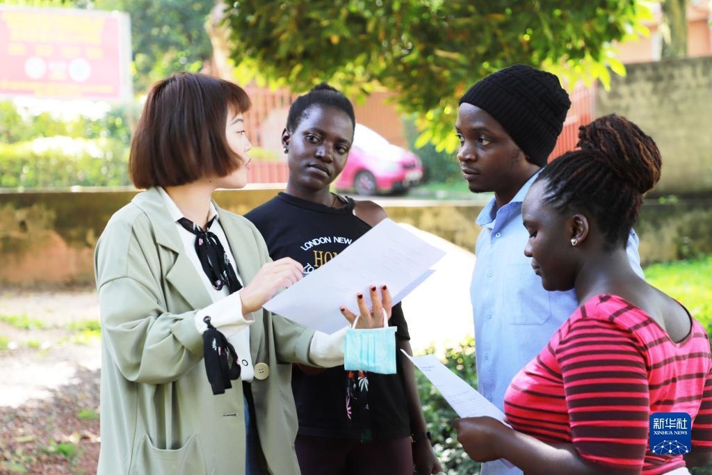 2022年4月19日,在烏干達首都坎帕拉,麥克雷雷大學孔子學院中文教師王夢云(左)與學生進行交流。新華社記者張改萍攝