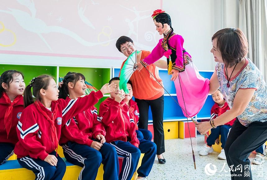 呼和浩特市玉泉區(qū)通順街小學(xué)學(xué)生在體驗(yàn)杖頭木偶操縱技藝。丁根厚攝 -